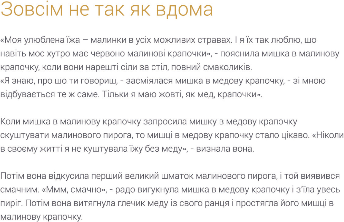 Auf die Bitte, doch vom Himbeertörtchen zu kosten, tat das die Honigpunktmaus sehr neugierig. Zuvor gab sie noch zu: „Ich habe noch nie in meinem Leben etwas anderes als Honigspeisen gegessen.“ Dann nahm sie endlich einen großen Bissen vom Himbeertörtchen – und es schmeckte ihr sehr gut.