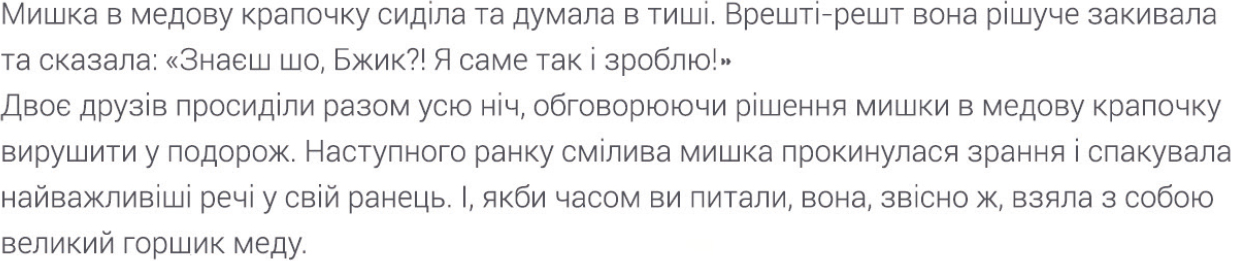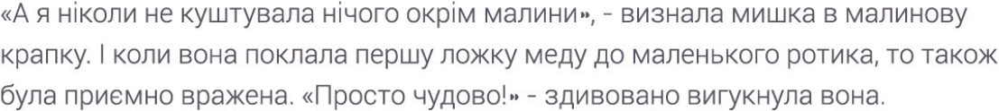 Auf die Bitte, doch vom Himbeertörtchen zu kosten, tat das die Honigpunktmaus sehr neugierig. Zuvor gab sie noch zu: „Ich habe noch nie in meinem Leben etwas anderes als Honigspeisen gegessen.“ Dann nahm sie endlich einen großen Bissen vom Himbeertörtchen – und es schmeckte ihr sehr gut.